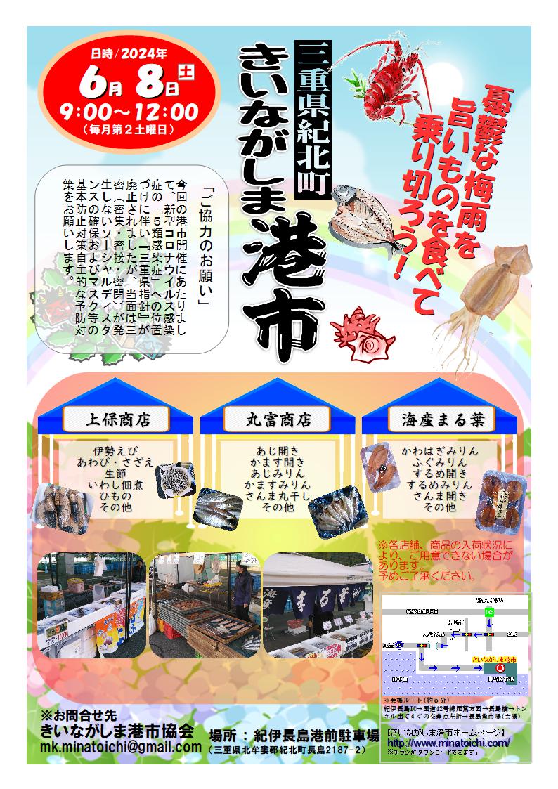 6月8日(土)に予定しています「定例きいながしま港市」は、予定通り開催いたします。皆様のご来場を心よりお待ちしております。よろしくお願いいたします。