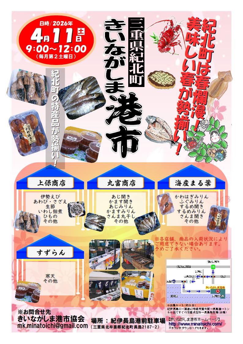4月11日(土)に「定例きいながしま港市」を開催します。 魚介類や干物などの地元特産品が集まります。 皆様のご来場を心よりお待ちしております。よろしくお願いいたします。